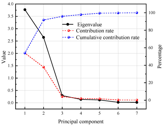 The characteristic value, contribution rate, and cumulative contribution rate of the principal components are shown in Figure 7. According to the requirement that the cumulative contribution rate of the principal components is greater than 80% [21], the cumulative contribution rate of the two principal components is 91.7%, so it can be considered that the two principal components can more fully reflect the overall performance indicators of the slurry. Table 8 shows the eigenvalue vectors of each index. It can be obtained that the indexes that determine the first principal component are the bleeding rate, initial setting time, and final setting time. The index determining the second principal component is the compressive strength of the stone body at 3, 7, and 28 days.
