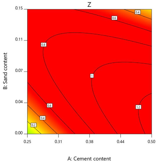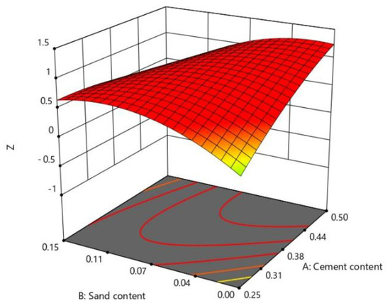 Since the interaction between A and B was obvious, C was fixed at a level, and the contour map and the three-dimensional response surface map of cement and sand content versus Z were obtained as shown in Figure 8 and Figure 9. The contour lines were dense and elliptical, which reflected the great influence of the interaction between the two factors. The contour lines were circular, which indicated that the interaction between the two factors was small [42]. As can be seen from Figure 8, the Z-value contour line in the lower left corner (low sand content and low cement content) was denser than the contour line in the lower right corner (low sand content and high cement content). Although the fluidity of the slurry was increased under the condition of a low cement content, the water evolution rate will increase and reduce the stability of the slurry as well as the gel time. Inevitably, the comprehensive properties of the slurry were reduced, and the Z value was reduced. The relationship between the Z values and the interactions between various factors were directly reflected by the response surface. The steepness of the response surface reflected the magnitude of the interaction between the two factors. When the sand content was 0% to 11%, the comprehensive score increases with the increase of the cement content and sand yield, as can be obtained from Figure 9. Sand as an aggregate can improve the strength of the slurry during cement hydration. However, an excessive amount of sand will lead to a higher viscosity of the slurry and lower overall performance of the slurry [41]. The slope increase of the response surface was obvious when the cement content was 25–34%, and the slope increase was slow when the cement content was 34–50%. This can prove that, when the cement content was 34%, the Z value was the highest, so the optimal cement content was 34%.
