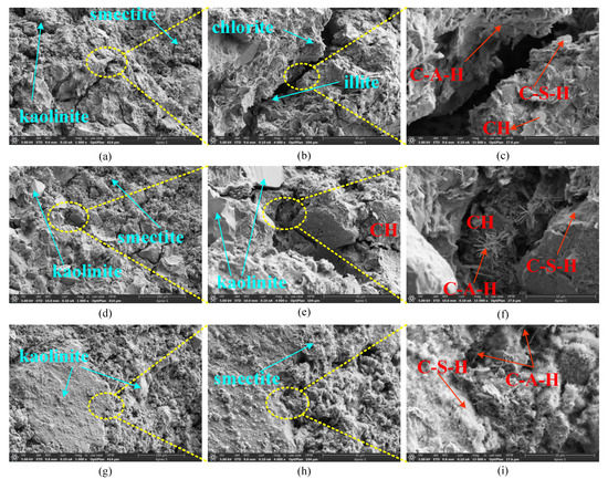 Figure 10g–i is the morphologies of the transition area of the sample interface after different magnifications. From Figure 10g–i, it can be seen that the bonding around larger clay particles is denser, and there are more montmorillonite, chlorite, and illite in the transition zone of the interface, which is consistent with Wang’s findings [46]. The flocculent C-S-H and rod-shaped C-A-H closely connect the two phases at the interface [47].