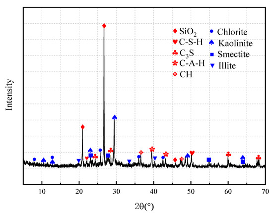 Figure 11 is a phase analysis diagram after processing. It can be seen from the figure that the silica diffraction peak is the highest. This is because the main component of river sand is silica. In addition, the silica contents in the cement clinker and clay minerals are 23.5% and 42.1%, respectively. Compared with the diffraction peaks of silica, the diffraction peaks of the clay minerals and cement hydration products have a lower intensity. The Ca(OH)2 diffraction peak was found in the phase analysis, and the Ca(OH)2 substance was also observed in the SEM diagram, which can indicate that the cement hydration reaction after curing 28 is not complete. Due to the lean cement, the gel material produced by the reaction is also less [46]. The diffraction peak of the hydration product is weak, which is also the main reason for the decrease in the strength of the consolidated body. The chemical reaction that occurs in the composite material is mainly a cement hydration reaction, and the new phases are mainly cement hydration reaction products, including C-S-H, C-A-H, ettringite, calcium hydroxide, etc. The consolidation of clay with water is a physical reaction, and the XRD spectrum shows that no new clay mineral phase is formed.