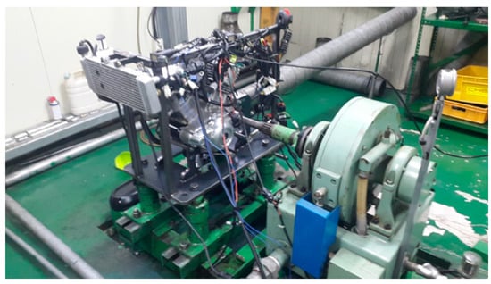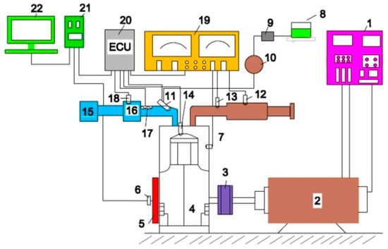 Schematic representation of setup for experiments and the engine testing system are depicted in Figure 1 and Figure 2, respectively. There are 22 components to this experiment system. The torque resistance for the experiment was supplied by a controller for dynamo testing systems (1) and a dynamometer from the AVL company (MCA325MO2) (2). Engine and dynamometer are connected by coupling (3). An encoder autonics (6) and sensor for temperature (7) were mounted on the flywheel (5) and the engine (4), respectively. The fuel travels to the fuel filter (10) from the fuel tank (8) and then to the fuel pump (9), where it is injected into the fuel injectors (11). The box to filter the air (15) and the throttle allow air to enter the intake pipe (16). The air heater regulated the temperature of the intake air (17). The analyzer for exhaust gases and transducer for cylinder pressure (19), ECU (20), data collection (21), and computer (22) receives signals from the sensor that detects oxygen quality (12), sensor for temperature of exhaust gas (13), sensor for cylinder pressure (14), angle of the throttle, and sensor for measuring air mass (18).
