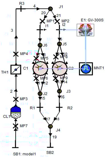 The simulation elements reflect the experimental engine’s components in Figure 3. The simulation elements are employed to investigate the properties of engine components. For the conditions of the experiment, the element E1 represents that the engine has been established in a steady state or in a transient state. Another factor was that the display screen MNT1 is absent in the engine under consideration. Through this monitor feature, investigators can see desired information including torque, ratio of residual gas, peak fire pressure, and effective release energy. The two factors SB1 and SB2 reflect the borders of the inlet and exhaust tubes, respectively. The factor CL1 in the experiment plays a role as a system air filter. The element TH1 was established from the throttle opening angle, which was completely opened during engine operation. The element restrictions R1, R2, and R3 take on reducing the pressure of the air stream through the intake and exhaust manifold (from 1 to 21). The contiguous elements from J1 to J6 take charge of allocating the gathered airflow in the tube. Some of the main indicators of airflow include velocity, temperature, and mass flow rate; they can be measured directly through MP1 and MP2. Fuel from the injectors I1 and I2 supply the cylinders C1 and C2, respectively.