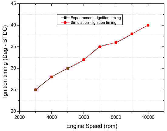 The aspects and robustness of our research were demonstrated by both theoretical and experimental tests, represented by red and black lines in Figure 4. Calibration and validation equipment (simulated model) help avoid imprecise measurements in estimating ignition time. The factors that are taken into account in the assessment of simulated model include values of engine specification such as bore, stroke, path length, and diameter of intake and exhaust pipe, as well as a list of values in experimental conditions.