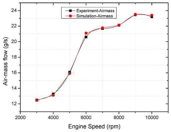 The air mass flow in the simulated model was adjusted by means of changing major coefficients known as intake pipe, throttle, intake ports, and exhaust ports. Results from simulation and experimental tests are presented in Figure 5. their values are compatible with insignificant differences. The highest different value is a very small number (1.42%) at 6000 rpm, which is acceptable when seen as an average value of the air mass flow during the experiment.