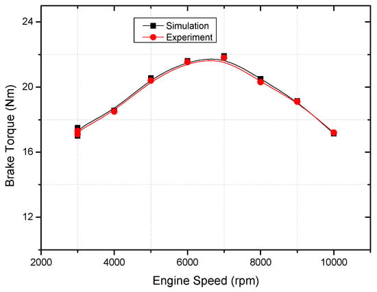 Errors in measurement of the engine brake torque and power were restricted by support from the accurate ratio between air-fuel and engine friction. On the other hand, the m parameter in Equation (3) is used as a key in reducing errors. Figure 6 shows the results for brake torque indicator in both cases (simulation and experiment). The numerical simulation values are similar with experimental data at each velocity. Interestingly, at 7000 rpm, the brake torque reached the peak at 21.8 Nm. The difference between theoretical and experimental cases was approximately 0.9%.