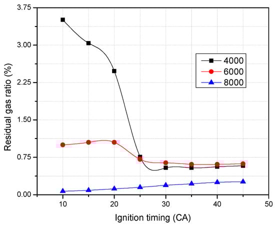 - This paper denotes a major impact on residual gas ratio, effective release energy, performance, and characteristics of emissions resulting from ignition timing. The minimal residual gas proportion was 0.07% with a revolution speed of 8000 rpm and ignition timing of 10 °CA. Moreover, at 15 °CA of ignition timing, the highest effective release energy was 0.817 kJ at 4000 rpm, while at 8000 rpm, it was 0.8305 kJ at 25 °CA. At 6000 rpm, the highest braking torque was 21.57 Nm, while the minimal BSFC was 343.821 g/kWh.