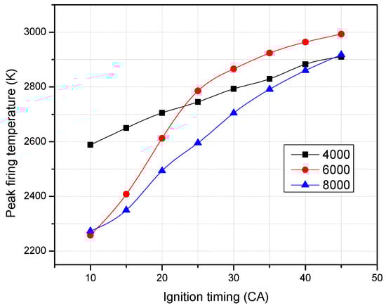 Figure 9 presents the effect of ignition timing on peak firing temperature. As the ignition timing increases, the peak firing temperature increases. It can be explained that when ignition timing is increased, with the lateness of the ignition timing, there will be more time for the mixture to blend better. This leads to the mixture being more evenly mixed, thereby leading to a complete combustion. The maximum peak firing temperature was 2993.26 K at 45 °CA of ignition timing as engine speed was 6000 rpm.