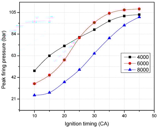 - The peak firing temperature and peak pressure rise increase until achieving a maximum value when ignition timing increases. The peak firing pressure and peak pressure rise reached a maximum with a revolution of the engine at 6000 rpm and timing of ignition at 45 °CA. The maximum values are 108.36 bar and 9.71 bar/deg, respectively.