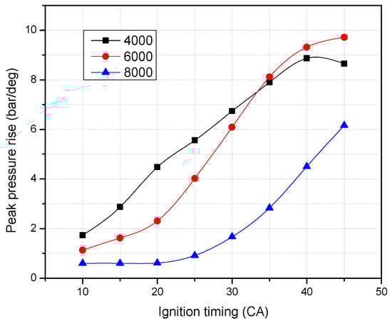 Figure 10 and Figure 11 illustrate the impact of ignition timing on peak firing pressure and peak pressure rise. The peak firing pressure and peak pressure rise show the same trend with the peak firing temperature when increasing the timing of ignition. The peak firing pressure and peak pressure rise reached the maximum when the revolution of the engine was 6000 rpm and the timing of ignition was 45 °CA. The maximum values are 108.36 bar and 9.71 bar/deg, respectively.