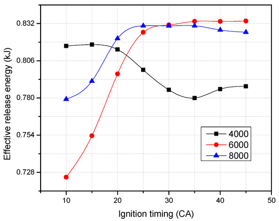 The impact of ignition timing on effective release energy is presented in Figure 12. When the engine revolution speed was 6000 rpm and 8000 rpm, the values of effective release energy trend upward. In particular, when the revolution speed was 6000 rpm, the effective release energy increased quickly before reaching its peak. Following that, a decline was found. When the engine speed was 4000 rpm, the effective release energy decreased sharply before steadily increasing. The maximum efficient energy release is an important metric that cannot be ignored in any engineering test. In our study, the coefficients change continuously as the engine speed changes. Two hypotheses are assumed. Firstly, the ignition time occurs late, resulting in too short of a burning time, so the fuel cannot be completely converted into heat. In contrast, if the burning time is long because of the advanced ignition time, energy in the form of heat will be significantly lost. This explains why the efficient release energy is sharply increased at the first stage and is then controlled by ignition time. Secondly, the combustion reacts in a short time since energy occurs simultaneously at TDC. In order to optimize the thermal energy for efficiency, the total heat release must be concluded in a short time. This leads to the increased frequency of the energy release to be close with the Otto cycle. Moreover, the range of engine velocity plays a role in driving the total energy release “heat” [25]. The best effective release energy at 4000 rpm and 15 °CA of ignition timing was 0.81725 kJ. Additionally, the best effective release energy at 6000 rpm and 8000 rpm was 0.83374 kJ and 0.83407 kJ at 45 °CA and 25 °CA of ignition timing, respectively.