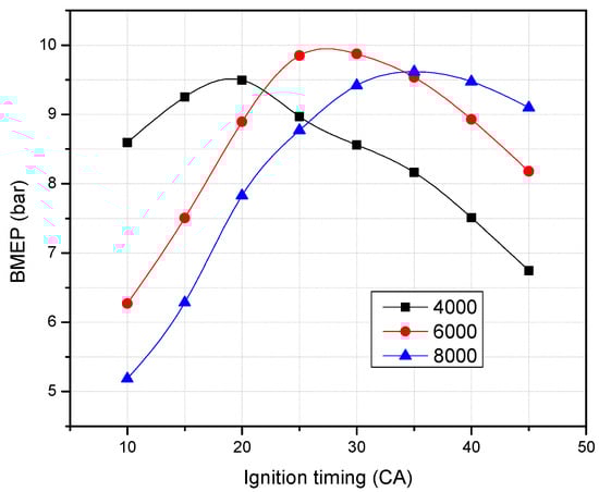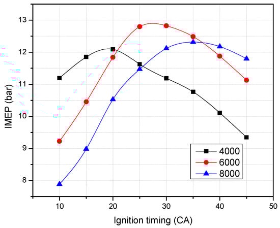 The effects of ignition time on BMEP and IMEP are presented in Figure 13 and Figure 14, respectively. The phenomenon can be observed under two stages. In the first stage, BMEP and IMEP rapidly increase to a clear peak value. In the next stage, the trend reverses steadily. At each revolution speed, the optimal values of BMEP and IMEP during the same time the ignition time reached its peak were reported. This can be explained by the phenomenon that the moment of ignition occurs simultaneously with the release of energy. Some noteworthy values are the ignition time benchmark (optimal value) obtained at 9.49 bar on BMEP and 12.09 bar on IMEP at 4000 rpm—20 °CA. Under other conditions (6000 rpm—30 °CA), the optimal value was 9.87 and 12.82 bar on BMEP and IMEP, respectively. Increasing at 8000 rpm and 30 °CA of the ignition time, BMEP and IMEP reached 9.62 and 12.12 bar. This denotes that the ignition time clearly depends on these conditions.