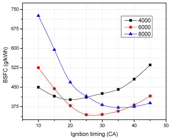 The effect of ignition time on BSFC is shown in Figure 15. The trend is opposite to that of BMEP and IMEP. During the first stage, BSFC went down continuously until it met the minimum value, and then the trend reversed. One interesting phenomenon to note is that the trends of BMEP and BSFC run in opposite directions [26]. At each engine speed, a set of numbers including ignition time and fuel consumption is reported. The minimal value of BSFC was reported with 401.89 g/kWH at 4000 rpm and 20 °CA. At the same speed (6000 rpm) and increasing at 25 °CA of the ignition time, BSFC reached 343.82 g/kWh. If the set of numbers is increased to 8000 rpm and 35 °CA, the BSFC value is 371.69 g/kWh.