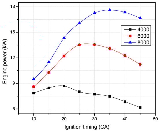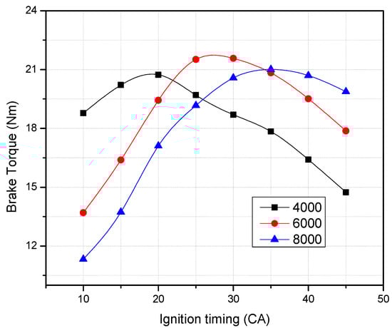 Figure 16 and Figure 17 also highlight the relationship of ignition time on power and braking torque, respectively. When the ignition time had an increase on BMEP, the trend of engine brake torque was consistent with the engine power trend. Their trends clearly divide into two stages. In the early stage, they rose steadily until reaching their optimal values. The second stage can be observed with reverse trends that occurred at the same ignition time, while the ignition time continuously went up. Furthermore, at each revolution speed, the specific values of the combustion time and optimal performance are presented. At 4000 rpm and 20 °CA, the maximum engine braking torque was 20.74 Nm, while the maximum power was 8.96 kW. At 6000 rpm, their values were 21.57 Nm and 13.55 kW under 30 °CA ignition time, respectively. At higher speed (8000 rpm) and 35 °CA, 21.01 Nm and 17.6 kW were respectively reported.