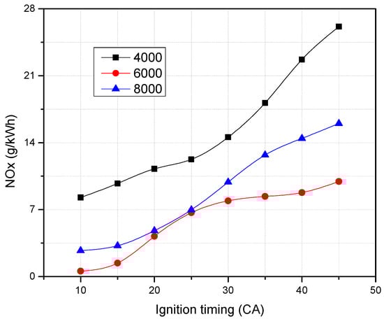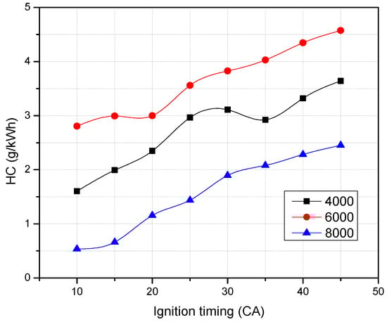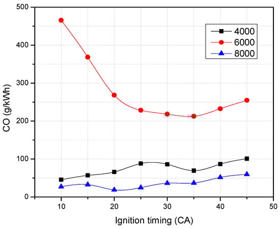 Figure 19 presents the effect of ignition timing on the carbon monoxide emission. At 4000 rpm, the CO emission declined, while the ignition timing increased from 10 to 35 °CA of ignition timing. After this, the CO emission increases. At 6000 rpm and 8000 rpm, the CO emission trend fluctuates when increasing ignition timing from 10 to 45 °CA of ignition timing. This denotes that the residual gas plays a key role in the characteristics of CO emission. In particular, when the residual gas proportion increases, it leads to a reduction of the fresh air on the next charge. Hence, the growth of the residual gas directly increases CO emission.