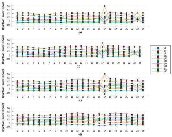 Reactive power generation is performed by thermal generators, which must comply with the maximum and minimum reactor power generation restrictions shown in Table 2. In addition, the dispatch of reactives by the generators must comply with other restrictions, such as the magnitude and angle of voltage at the nodes, and the maximum apparent power that can flow through the lines. This means that as the reactive load increases, the dispatch changes in the 24-h period, as can be seen in Figure 7.
