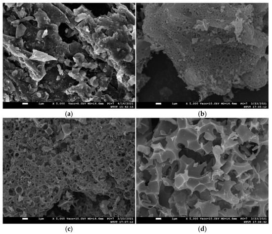 Micrographs obtained via SEM: (a) CSC, (b) CSCK1, (c) SCSK2, and (d) CSCK3.