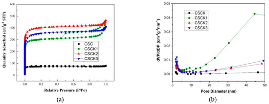 (a) N2 physisorption curves; and (b) pore size distribution of CSC and CSCKs.