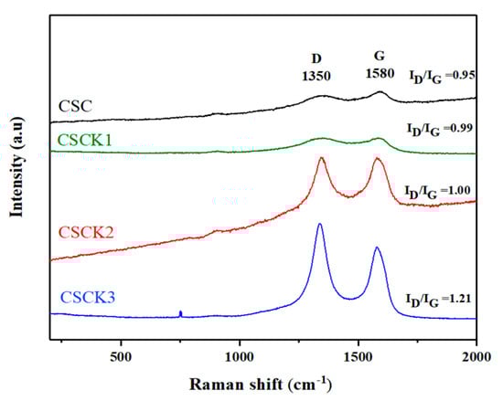 Raman spectroscopy was carried out to investigate how the structures of the materials evolved as KOH was added in different concentrations while the materials were being activated. Results for the spectroscopy are shown in Figure 3. Two apparent bands are detected approximately at the wavenumbers of 1350 and 1580 cm−1. At about 1350 cm−1, band ‘D’ appears as a result of the existence of imperfections or defects for the material. On the other hand, band ‘G’ ca. 1580 cm−1 corresponds to the basal planes of graphene vibrating in the stretching mode. The ratios of ID to IG are representations of structural defects and disorders of the graphitic structures. In this study, the aforementioned ratio for the samples descend according to: CSCK3 (1.21) > CSCK2(1.00) > CSCK1(0.99) > CSC (0.95). The ID/IG ratio for CSC was relatively low, which is attributed to its porous structure that are underdeveloped. Meanwhile, the aforesaid ratio for all CSCK samples was higher than 1, indicating the presence defect-rich structures in CSCKs. This indicated that KOH activation brings about considerable defect formation, resulting in the material’s increased surface area and porosity (Table 1).