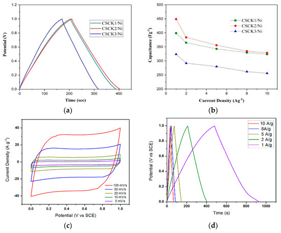 Electrochemical characteristics of CSCKs/Ni electrodes in 6 M LiNO3 aqueous electrolyte in a three-electrode system: (a) GCD curves at 2 A g−1 for CSCKs/Ni electrodes; (b) specific capacitances of CSCKs/Ni electrodes at various current densities; (c) CV curves of CSCK2/Ni electrode at various scan rates; and (d) GCD curves of CSCK2/Ni electrode at various current densities.