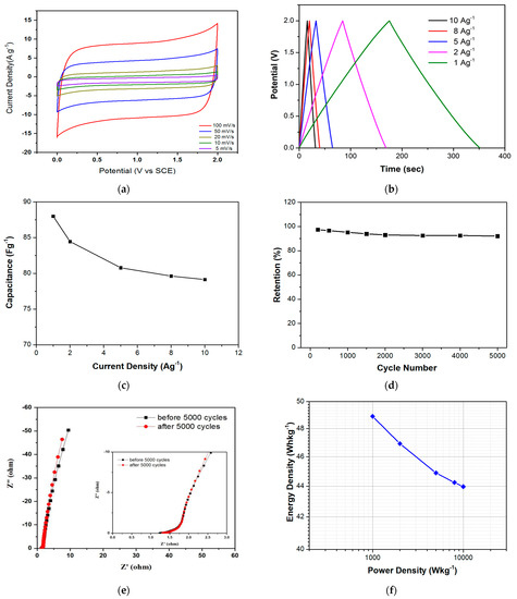 Specific energy densities (E, Wh·kg−1) and specific power densities (P, W·kg−1) for the symmetric supercapacitors were acquired via Equations (2) and (3):
