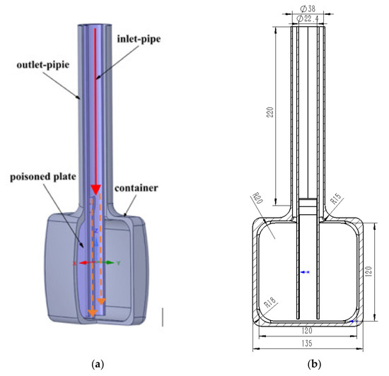 Due to the internal complexity of the DPHM model, it was simplified for the convenience of numerical simulation analysis, as shown in Figure 1. The main structure of DPHM is made of the inlet-pipe of hydrogen, the outlet-pipe of hydrogen, container and poisoned plate, in which the structure of the pipeline is coaxial multi-layer casing. The distance between the exit of the inlet-pipe of hydrogen and the bottom surface of the container is 5 mm. After the liquid hydrogen flows along inlet-pipe of hydrogen for a distance, the poisoned plate separates the flow of it into two uneven sides, which are injected vertically to the bottom surface of the inner cavity under the action of pressure difference to form a circular jet for cooling [23]. The pressure generated by the impact forces the liquid hydrogen to flow radially along the wall, and then, due to the limitation of the internal structure, it is concentrated upward at the neck of the container and finally discharged by the hydrogen return tube. Due to the thermal deposition caused by neutron collisions, liquid hydrogen is mainly heated by pipelines, poisoned plate and container during flow.
