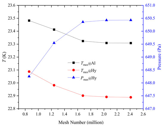 In this paper, the grid independence of DPHM is verified under the conditions of beam power of 100 kW, pressure of 15 bar and inlet flow of 30 g/s. Five groups of grids were selected for comparison, and the three parameters of maximum temperature, maximum pressure of liquid hydrogen and maximum container temperature were detected. The results are shown in Figure 3. It can be seen that the temperature variation tends to be stable when the number of grid elements exceeds 1.68 million, indicating that the independent solution can be obtained for the grid number at this condition. The Grid Convergence Index (GCI) was used to quantify the grid independence [32]. The GCI34 for fine, and medium grids was 1.76%. The GCI45 for medium and coarse grids was 4.61%. The value of GCI45/(rpGCI34) was 1.03, which was approximately 1 and indicates that the solutions were well within the asymptotic range of convergence. Therefore, considering the computational efficiency and accuracy, the fourth group of grids was finally employed for calculation.