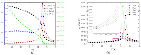 Variations of thermophysical properties of liquid hydrogen under different pressure: (a) Pressure = 15 bar; (b) Specific Heat (different pressure).