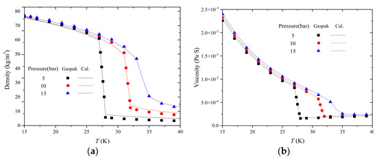Figure 5 shows the density and viscosity distributions at temperatures of 15~40 K at pressures of 5, 10 and 15 bar. In order to verify the accuracy of the above model, a comparison was made with the data of GASPAK [38], the results showing that the two sets of data were well in agreement and that the error was within the allowable range.