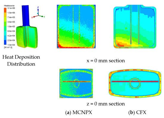 Comparison of heat deposition calculation results between MCNPX and CFX: (a) MCNPX; (b) CFX.
