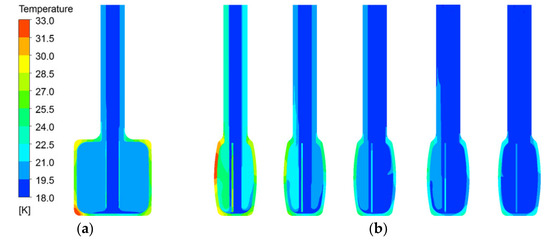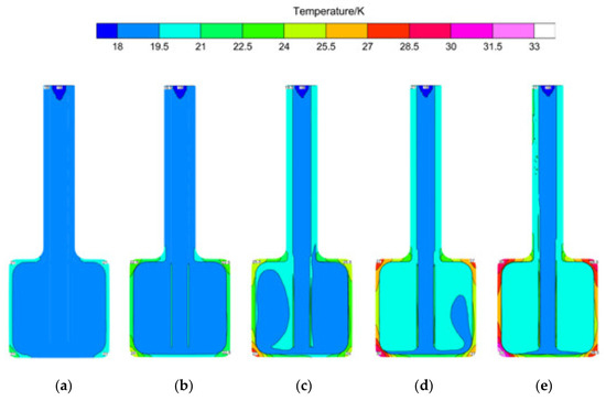 The analysis of flowing process mainly includes the selection of flow range and the analysis of pressure loss. The higher the mass flow, the smaller overall temperature rise of liquid hydrogen, and the temperature distribution inside the container is relatively uniform, which is also beneficial to the neutron moderating effect. At the cross section of x = 0 mm, it can be observed, from Figure 9, that the average temperature of the side with lower liquid hydrogen flow is higher due to the uneven segmentation of the cross-sectional area of the import pipeline by the poisoned plate. The velocity contours under different mass flow are also listed, and it can be seen that the temperature distribution is basically unchanged but that the overall temperature decreases gradually with the increase of flow rate.