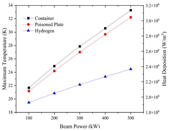 - With the beam power increasing, the maximum temperature of the container, poisoned plate and hydrogen maintain the linear growth trend. The maximum temperature of liquid hydrogen is close to the bottom recirculation zone due to the influence of the flow field and the heat deposition distribution of the poisoned plate.