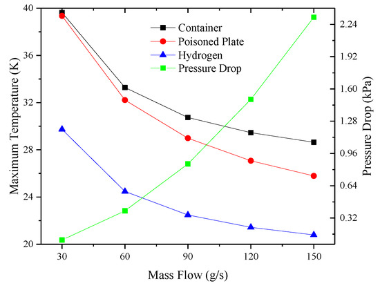 The effect of mass flow on maximum temperature under 500 kW beam power is shown in Figure 11. Specifically, the heat transfer effect is significantly improved by distinct increment of turbulence effect in the flow range of 30~60 g/s, while the slope decreases with the increase of mass flow, which proves that the cooling effect reduces gently. It also should be noted that the increase of mass flow is accompanied by the increase of pressure loss, which will be detrimental to the stability of the flow. The intersection point between the temperature curve of liquid hydrogen and the corresponding pressure drop curve is noted, which is in the range of 60~90 g/s, indicating that the cooling effect is the best and the flow is relatively stable.
