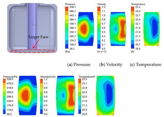 The liquid hydrogen carries out jet impact on the bottom surface, which was taken as the research object result of its good heat transfer effect, after flowing out of the hydrogen intake pipe with a vertical distance of 5 mm, as shown in Figure 12. For a smooth surface, with the flow of liquid hydrogen reaching the wall, the pressure forces the jet to flow axially along the wall. Combined with the pressure distribution, it can be seen that the target surface located in the impact zone is under the maximum pressure, and then diffuses and decreases along the periphery, leading to a gradual decrease in velocity. The temperature in the center area of the target surface increases slowly with a similar regularity. This is because the viscous boundary layer on the wall gradually thickens and the surface heat transfer coefficient decreases when the liquid hydrogen flows in the radial direction.