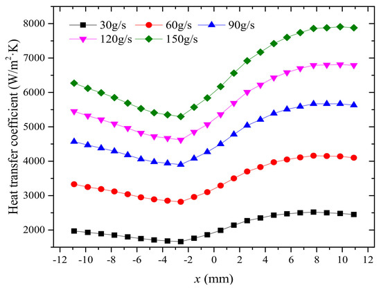 The distribution of the heat transfer coefficient of the target surface along the x axis.