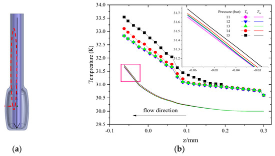 To explore the influence of law of pressure change in a pseudo-critical region, the inlet temperature of hydrogen is set to 30 K. Figure 14 shows the influence of changing mass flow on the axial distribution of the wall temperature, Tw, of the hydrogen intake tube and the bulk temperature, Tb, of liquid hydrogen inside the tube. The results show that the temperature of both the wall and the liquid hydrogen increases gradually with the deepening of the flow distance. This is because there is no heat source around when the liquid hydrogen flows into the pipeline at the beginning, so the temperature change is not obvious. After that, due to the influence of thermal deposition of the poisoned plate and container, the two kinds of temperature increase significantly, and the temperature rise range of the wall surface is about 3 K. When the pressure is 15 bar, the temperature value will change at the mutation position corresponding to the physical property of liquid hydrogen in Figure 4, while the temperature will not change at a distance from the critical value. Moreover, different pressures have little effect on the average temperature of the fluid in the tube. It can be concluded that under supercritical pressure, the drastic change of physical properties in the critical region will have a great impact on turbulent heat transfer, resulting in the deterioration of convective heat transfer.