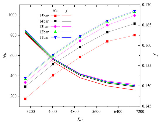In order to more specifically reflect the heat flow characteristics of liquid hydrogen inside the vessel, the relationship between the average Nusselt number on the target surface and the resistance f along the hydrogen inlet pipe and the jet Reynolds number Re was explored under different pressure conditions. As can be seen from Figure 15, Nu increases significantly with the increase of Re and tends to change linearly. Simultaneously, the flow boundary layer in the inlet pipe segment gradually becomes thinner, the flow resistance decreases, the resistance coefficient decreases, and the pressure on the target surface also increases. The intersection point of Nu and f represents the inlet flow of liquid hydrogen corresponding to different pressures when the optimal cooling effect is achieved under the premise of considering the comprehensive characteristics of flow resistance and heat transfer characteristics. On the other hand, with the continuous increase of Re, the variation trend of Nu corresponding to different pressures is the same. At the pressure of 15 bar, the corresponding overall curve of Nu moves down and the heat transfer capacity decreases, which further proves that near the critical region, while the physical property variation caused by the pressure change worsens the turbulent heat transfer.