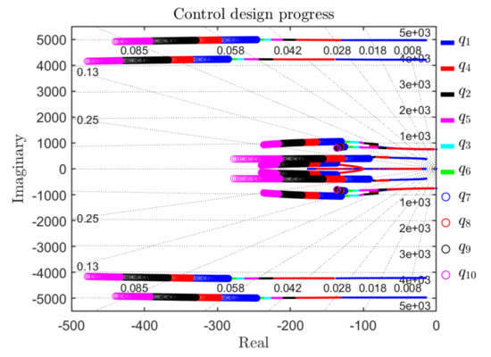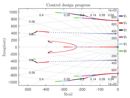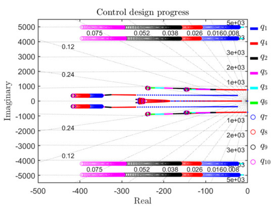 - Increase and calculate K using the MATLAB command lqr. Plot the trajectory of closed-loop poles, i.e., eigenvalues of . Increase until the low-frequency dominant poles obtain sufficient distance from the imaginary axis. Freeze and proceed to Step 3.