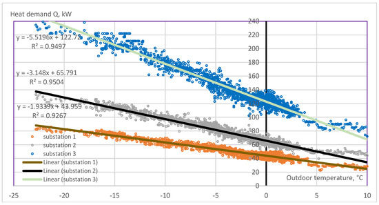 Outdoor temperature and heat demand are measured every hour for each substation. Examples of this dependence for three selected substations using data collected during the 2020/2021 heating season (October–April) are shown in Figure 2.