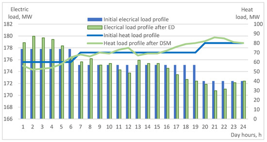 Electric and heat load profile before and after economic dispatch according to demand-side management.