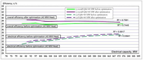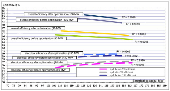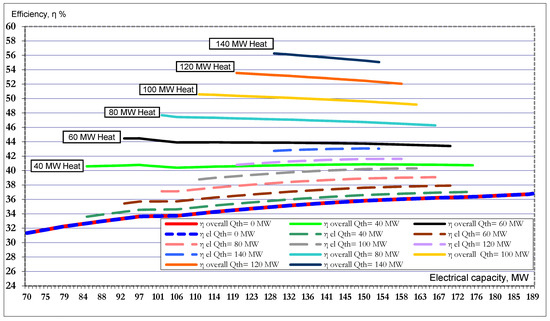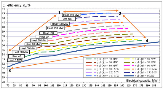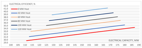 It can be seen that electrical efficiency is increased when the heat load becomes larger. When the heat load is maximum, the electrical load is lower (150 MWnet). The maximum electrical load (190 MWnet) is possible when there is no heat load, but in this case, electrical efficiency is the lowest.
