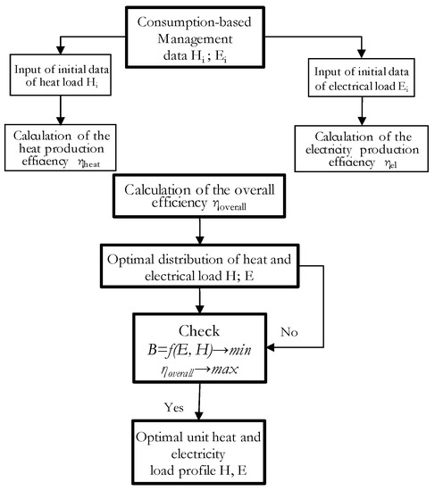 When distributing the CHP unit load using heat demand-side management, optimisation tasks were formulated, namely the minimisation of primary energy consumption and maximisation of the total useful electrical load of the CHP unit at a given electrical load of the unit and at a given heat load of consumers.