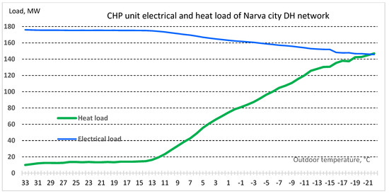 The model used in this article was based on the CHP plant and district heating network in the city of Narva (in north-eastern Estonia). The district heating company supplies heat to about 60,000 residents. Narva’s district heating network is 78 km long and connected to 730 buildings. Heat is generated at the Balti Power Plant (CHP unit), which consists of two circulating fluidized bed boilers, including one reheat and steam turbine, which is a three-casing reheat condensing impulse reheat turbine with uncontrolled extraction for seven stages of feedwater heating. The fuel used in the Balti Power plant is local fossil fuel oil shale mixed with wood chips [35]. The DH circulating water is heated in a district heater using steam from the crossover pipes between the intermediate-pressure and low-pressure parts of the turbine. Extra steam from the hot reheat steam line is supplied to the peak load and the auxiliary steam is supplied to an external auxiliary steam header. The maximum DH load of the facility is 160 MW and the maximum water outlet temperature is 130 °C. The DH inlet water temperature ranges from 40 °C to 60 °C. The annual heat demand in Narva is about 450 GWh. The unit’s annual electricity production is approximately 1300 GWh. The main inputs for these analyses are electricity and heat production and process efficiency as per the data available.