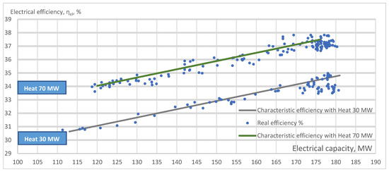 The efficiency characteristic of a CHP unit depends not only on the electrical load, but also on the amount of heat supplied. The electrical efficiency dependence on the electrical load of the CHP unit for different heat loads is shown in Figure 4.