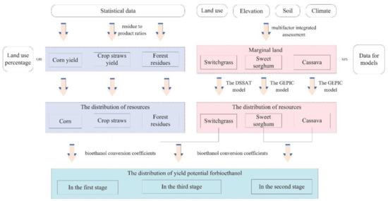 The Chinese government has announced that the development of diversified non-grain bioethanol is being encouraged, which should not compete with cultivated land and food. According to the current actual situation of bioethanol development and China’s Liquid Biofuel Development Roadmap [14], and synthetically considering the resource potential, technology level, feedstock use efficiency, and cost, we defined three stages of bioethanol development. In the first stage, by 2020, first-generation bioethanol was mainly developed. Corn ethanol was analyzed as a representative. In the second stage, from 2020 to 2030, 1.5-generation bioethanol will mainly be developed. Sweet sorghum and cassava ethanol were analyzed as representatives. In the third stage, from 2030 to 2050, second-generation bioethanol will mainly be developed. Switchgrass, crop straw, and forest residue ethanol were analyzed as representatives. Our comprehensive evaluation system, integrating statistical methods, crop growth process models, and geographic information system (GIS) techniques, was constructed for analysis (Figure 1).