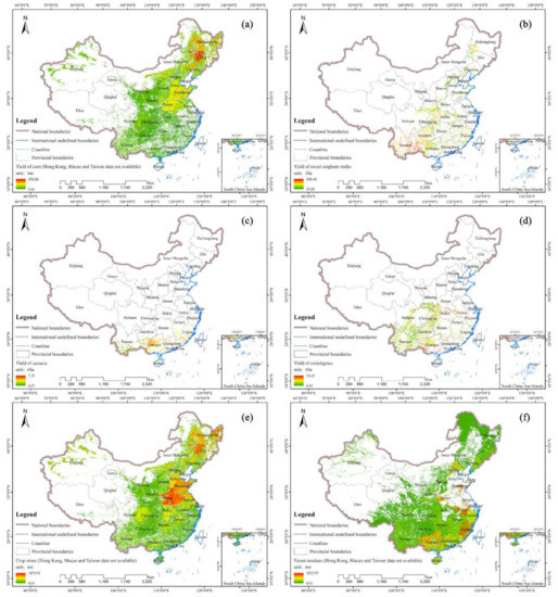 The distribution of bioethanol feedstock resources in China: (a) corn yield; (b) sweet sorghum stalk yield; (c) cassava biomass; (d) switchgrass biomass; (e) crop straw yield; (f) forest residue resources.