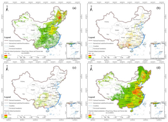 The distribution of bioethanol yield potential in three stages in China: (a) first stage; (b) second stage; yield potential based on (c) switchgrass in the third stage; and (d) crop straws and forest residues in the third stage.