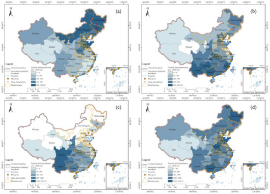 Based on the results of the bioethanol yield potential for the three stages in Section 3, Figure 4 illustrates the total quantities of potential production in each province gained by provincial statistics. The results are divided into four objects in Figure 4 consistent with the objects in Figure 3. Comparisons with the current market situation, market demand, and promotion policy will be discussed in this section. In the first stage, Heilongjiang, Jilin, Inner Mongolia, and Shandong showed a high bioethanol production potential, with annual production of over 2 million tons. The spatial distribution of the bioethanol production potential roughly matches the current market situation. Gasohol has been used in Tianjin, Heilongjiang, Henan, Jilin, Liaoning, Anhui, Guangxi, Hebei, Shandong, Jiangsu, Inner Mongolia, and Hubei Province. Gasohol has been developed most vigorously in the northeast, with a market share of more than 90%. An array of bioethanol production plants were built in Jilin, Heilongjiang, and Liaoning Provinces [27]. Tianjin also shows positive development, being the first province to achieve the closed promotion production of ethanol gasoline for vehicles. The above-mentioned regions hold a feedstock potential and active policies, which will be given priority in the development of bioethanol industrialization and be expected to drive the bioethanol development of the surrounding areas.