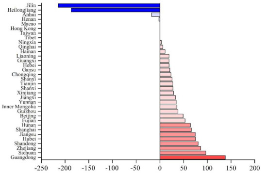 Provincial market gap in China. Note: The blue color means that the value of the market gap is negative, that is, bioethanol is overproduced. The red color means that the value of the market gap is positive, that is, bioethanol production cannot meet the market demand.