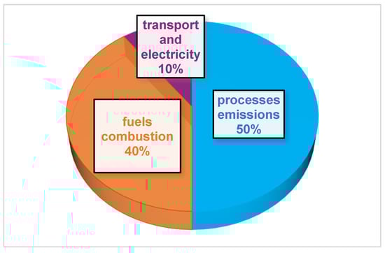 Therefore, the reduction of CO2 emissions, generated during the burning of Portland clinker has been an important environmental problem for a long time. In this regard, more and more new research and theoretical simulations as well as novel implementation activities to reduce this negative effect are carried out, e.g., [,,,]. Their primary goal is to reduce as much CO2 emission as possible, which is generated in OPC production at almost all stages (Figure 2). Therefore, there is an increasing development of modern binders based on the concepts of sustainable construction, e.g., [,,,,,,,].