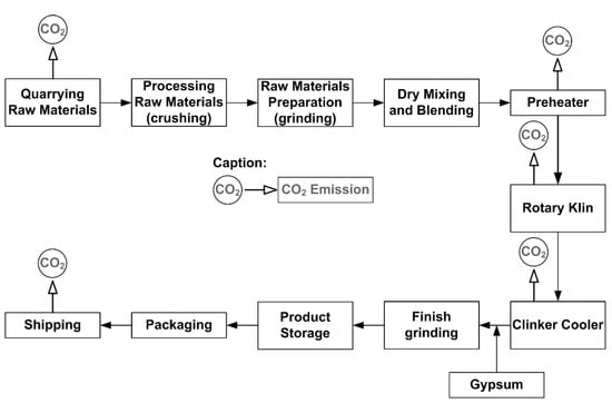 The burning of Portland clinker and the subsequent production of OPC involves many complex technological operations. According to [], Figure 2 provides a detailed diagram of these processes indicating the stages in which CO2 emissions occurs.